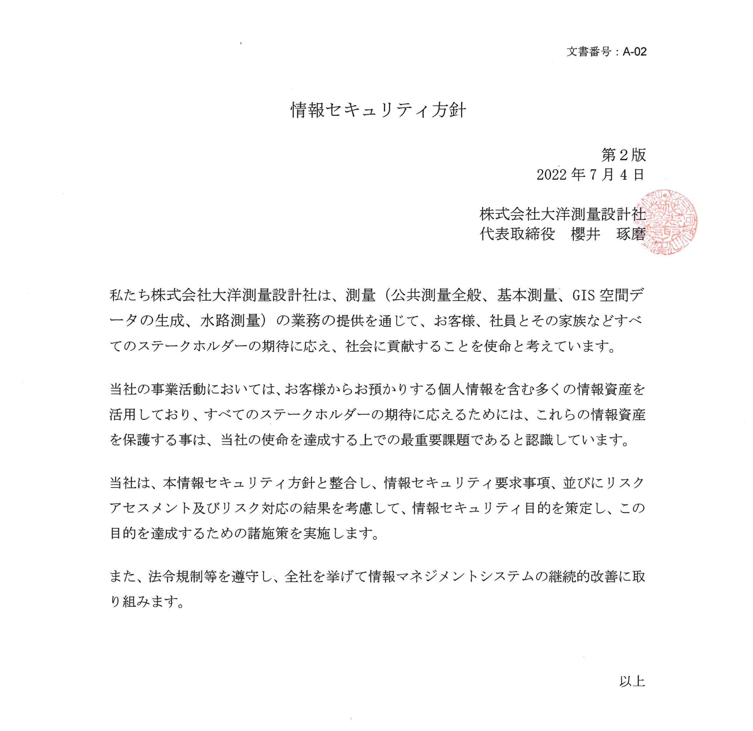JIS Q 27001:2014(ISO/IEC27001:2013)の要求事項に基づき、当社の情報セキュリティ方針を以下に定めます。