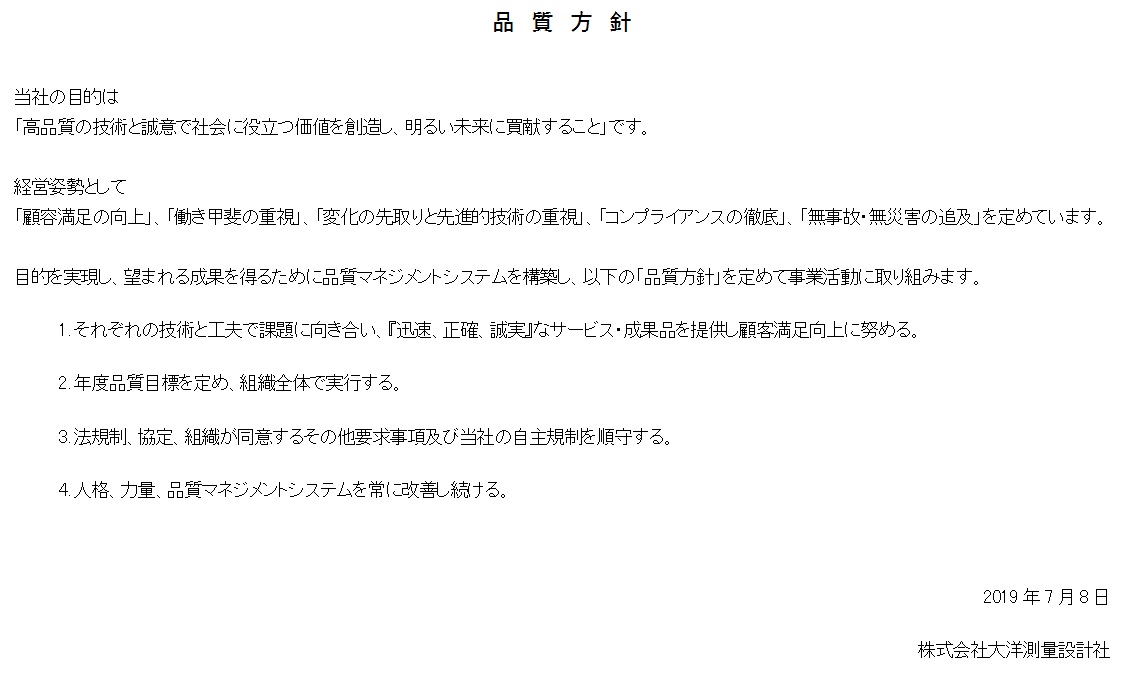JIS Q 9001:2015(ISO 9001:2015)の要求事項に基づき、当社の品質方針を以下に定めます。